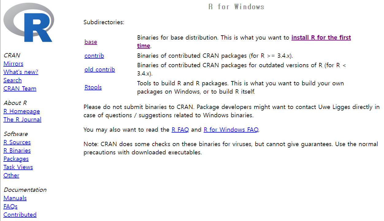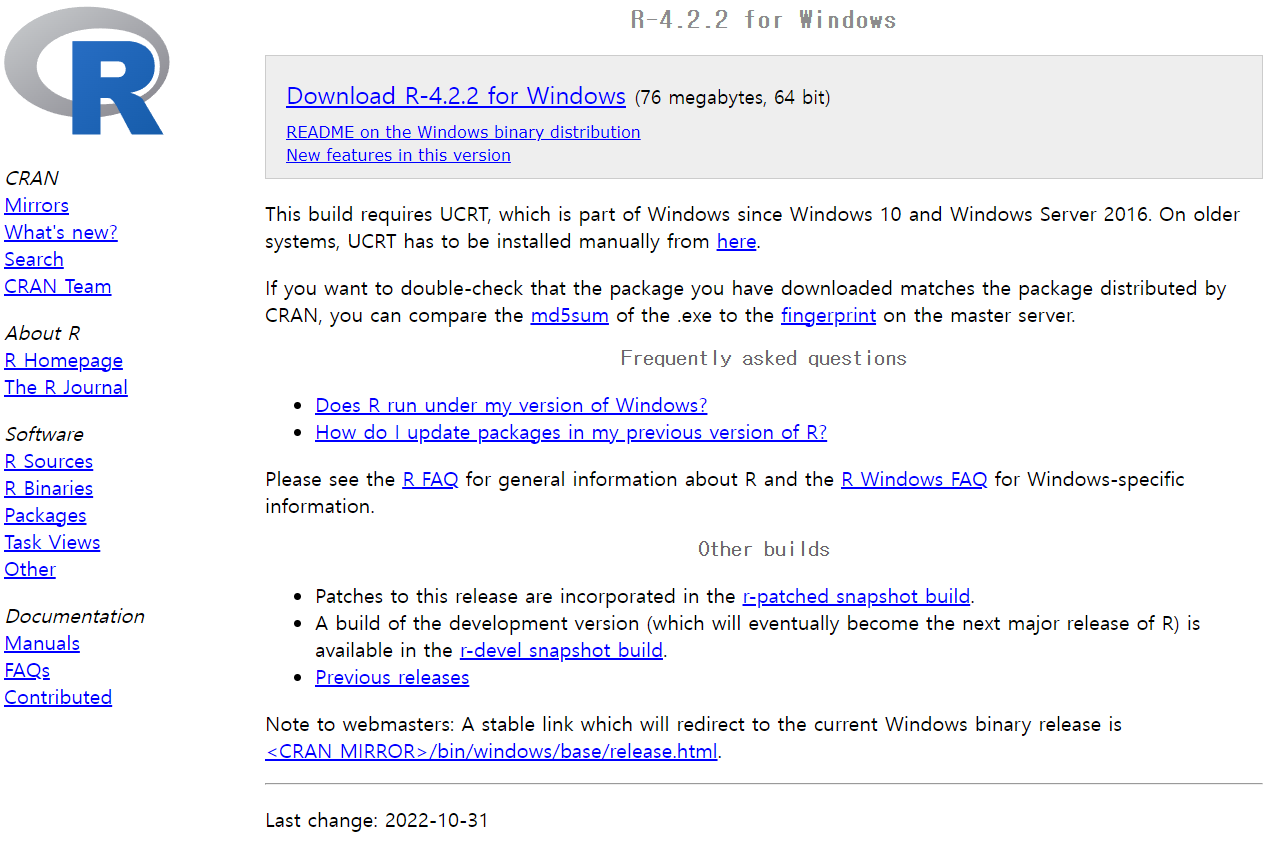 검색엔진에 CRAN 이라고 치면 사이트가 나온다. 아니면 아래의 주소로 이동하자.