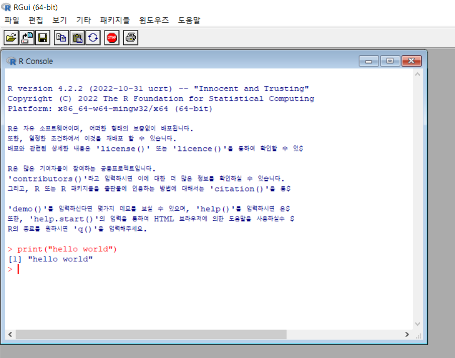 [1] "hello world"로 뚝 떨어져 출력된다면 R도 설치 성공이다.